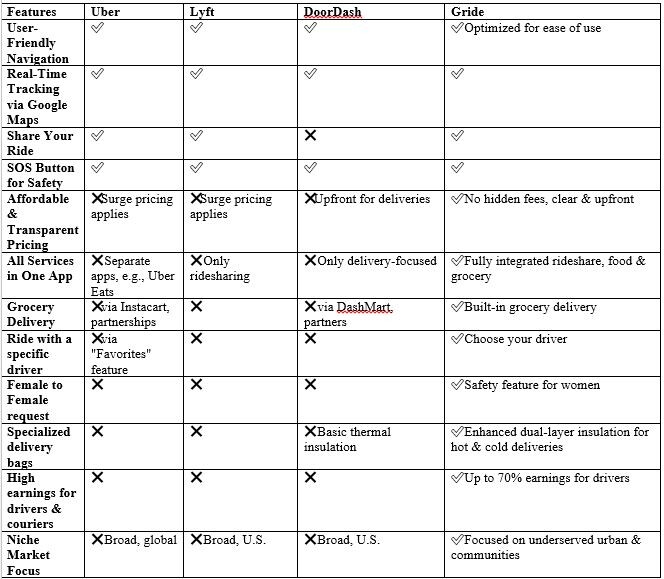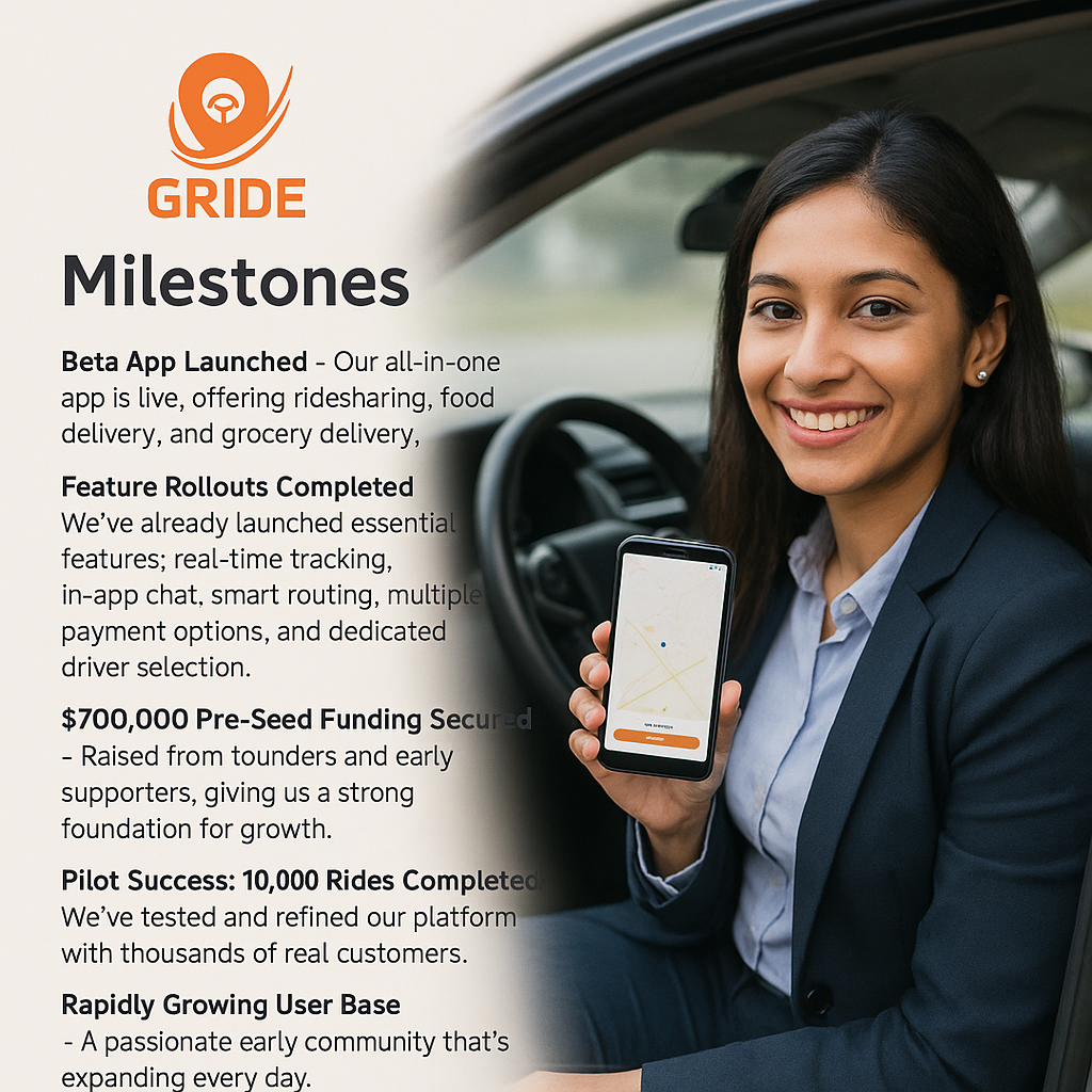 We're building technology that eliminates high costs, tackles fragmented service delivery, and bridges economic disparities that limit market access for many. With features tailored for real-world needs from female-specific ride requests to transparent pricing with no hidden fees, Gride stands out by offering meaningful innovations, not just gimmicks.