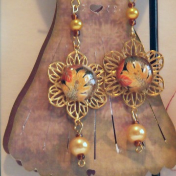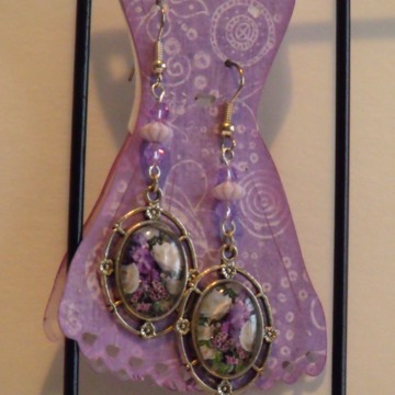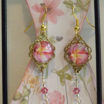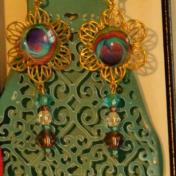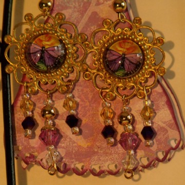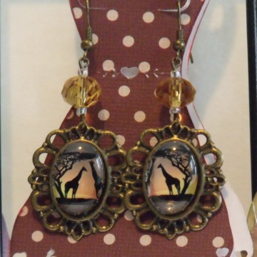 These beautiful pierced earrings were made by Pamela Molly's Mom. The feature a silouett of a giraffee in sunset. This is covered in a glass dome and mounted in a auntique gold cabochon setting. Gold crystal accents these beautiful earrings