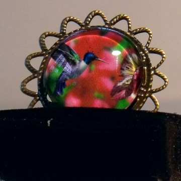 This beautiful brooch is a high quality photo of a hummingbird with beautiful pink flowers covered in 1" domed glass. It is attached to a antique gold cabochon setting with a pin backed. It is a beautiful addition to a fashion scarf. This was made by Pamela from Jewels from the heart