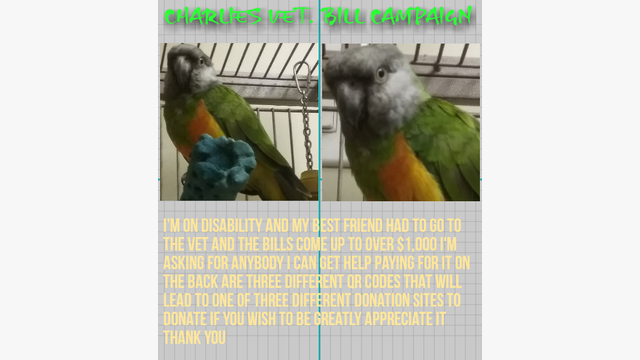 11 year old Senegal parrot named Charlie needs to have this fixed as you can see the bill is going to come out to between $1,000 and $1,200 and I'm on disability which makes it really hard to pay for this bill he was only supposed to be in there for 2 days now he's in there for 4 days and I'm hoping I can get some help so I don't have to worry about the the deal when I have to pick him up along with worrying about if he's alright I got them about eight nine months ago after his owner passed away and with my depression and everything he is literally the only thing is put a genuine smile on my face and I need to get this bill paid as soon as possible or else it's going to cost more and more with interest in stuff any help is appreciated I will keep peopandle up-to-date with what's going on