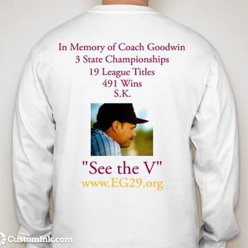 Incorporating Elton's famous "See the V" quote, this shirt honors his staggering accomplishments such as 491 wins,19 league titles, and 3 state championships. Made from high quality, moisture wicking material, these shirts are a $30 value, and feature both the Elton Goodwin Foundation logo (right shoulder) and the SK Baseball logo (left breast).