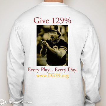 "Give 129% - Every Play....Every Day." With an inspiring picture of Elton on the back, the Foundation logo on the right shoulder, and the SK Baseball logo on the left breast, these high quality, long sleeve shirts are made from moisture wicking material; and are a $30 value.