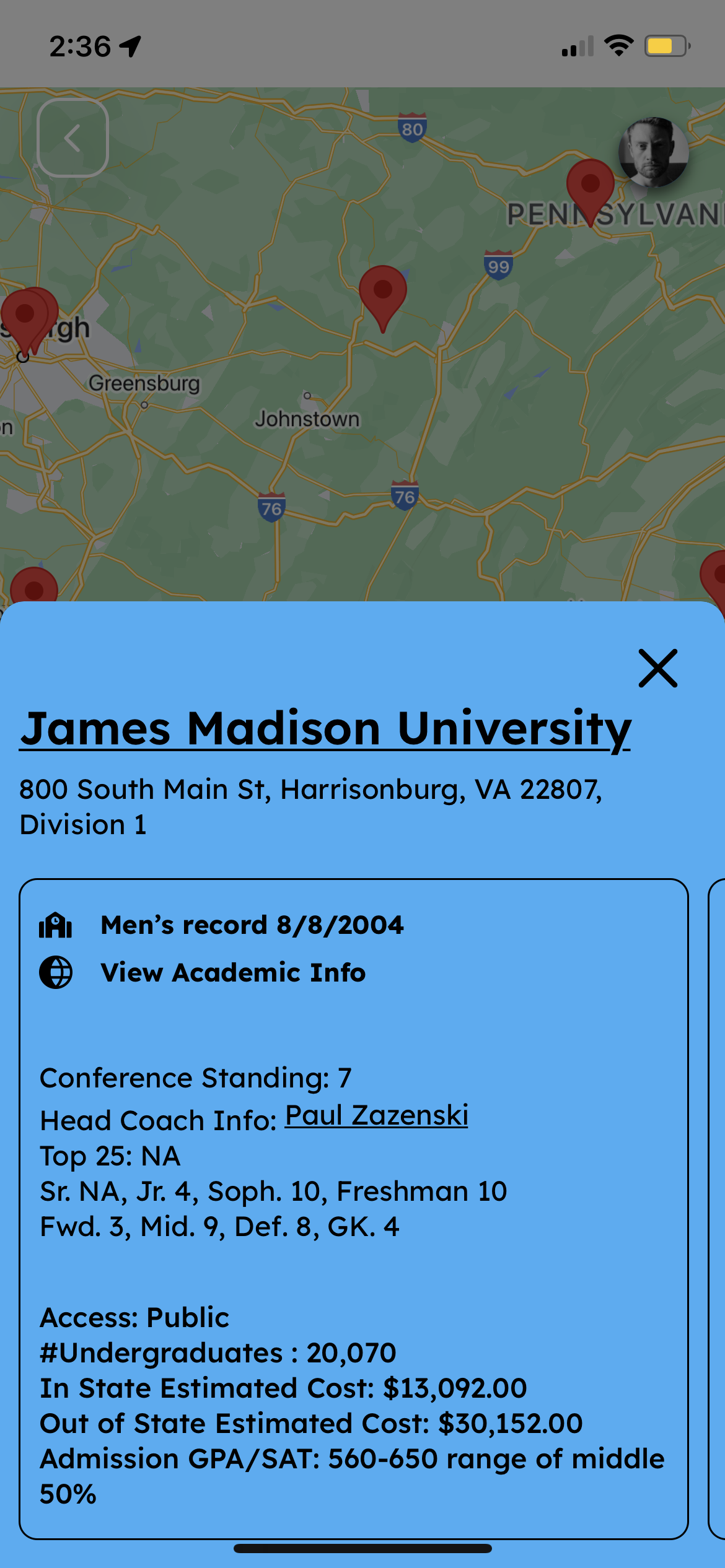 Want to go to a big school with a nationally recognized athletic program? Do you have specific budget requirements? Interested only in colleges with smaller class sizes? Looking for schools near the beach, or close to your home town? The CSP Map has all of the useful and discriminating information you need to find the right school and then get ahead of the recruiting process.The CSP Map database includes school division, conference ranking, team record, coach contact information as well as a breakdown of team details such as the number of players in each class and what positions they play. Is the school about to graduate three defenders, their best offensive player, or a goalie? Can you fill that position? The app also provides access to academic admission info/gpa, prominent majors, tuition, school size, and other crucial information players need to match their skills with the right team and school.