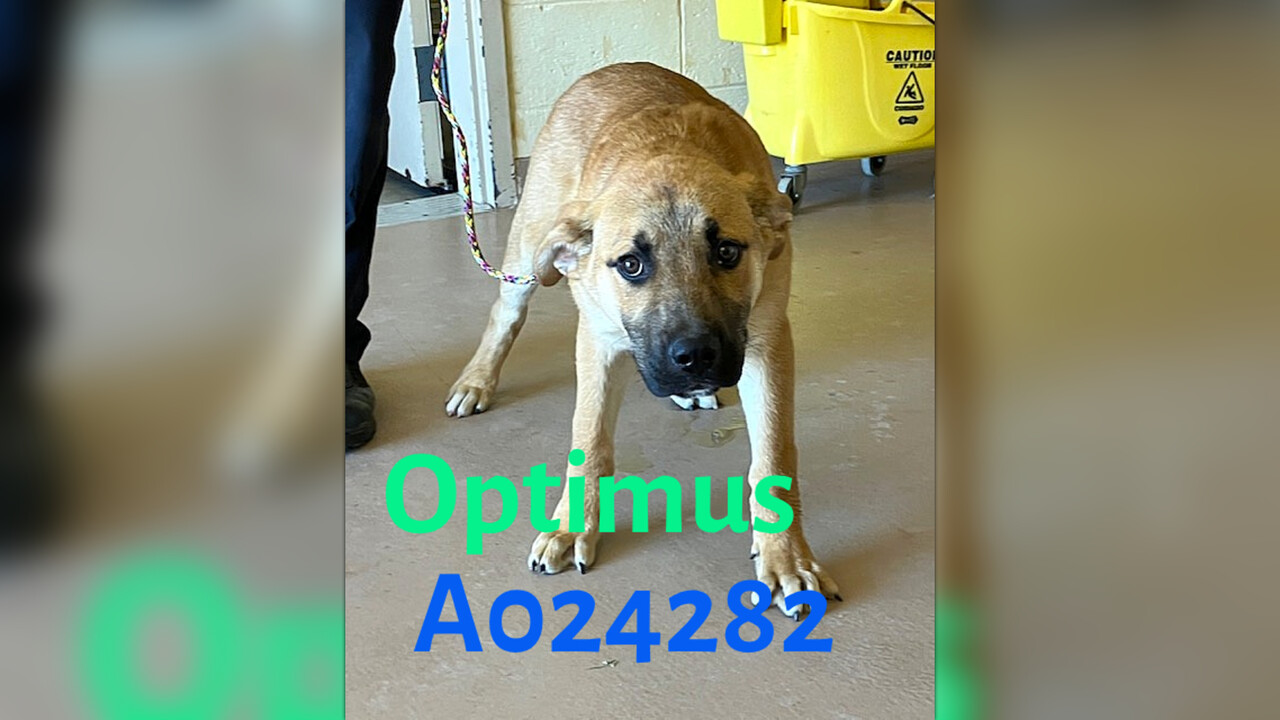 OPTIMUS -MIXED BREED  MALE - PUPPY - 7 MONTHS -41 LBS ON INTAKE  DATE 3-18-25  sweet and dog and people friendly.  HE has  now been placed on the urgent list and must have commitment by 4 PM  on Friday, APRIL 11, or face being euthanized for space.