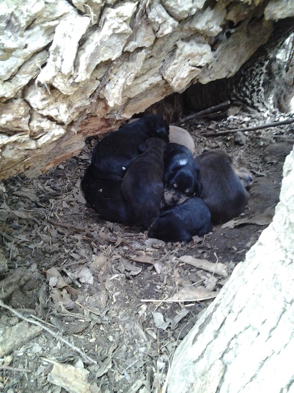 One afternoon, passersby heard whimpering coming from a distant tree. Upon approach, Mama dog darted from a hole in the base of the old oak tree, and inside were 9 brand new puppies. No one even knew that she was pregnant.