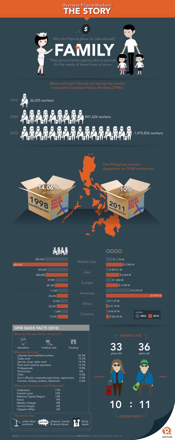 Take a look at the below infographic from Rappler to give you an indication of just what the vital statistics are. Overseas workers are generally unksilled, often employed in a domestic capacity in richer countries. Regularly mistreated and usually employed as a special class of employees that do not have access to the same rights as locals.