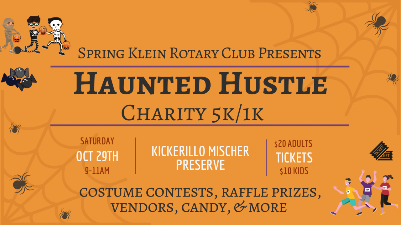 Join us for a family friendly, spooky, and all around fun 5k/1k along the Kickerillo-Mischer Preserve. Come dressed in your best costume and be ready to walk, crawl, float, fly or simply just strut your stuff - prizes for top kid, adult, and pet costumes! All funds raised benefit two local groups - the Spring Klein Rotary Club and Eye See Hou (more info below).