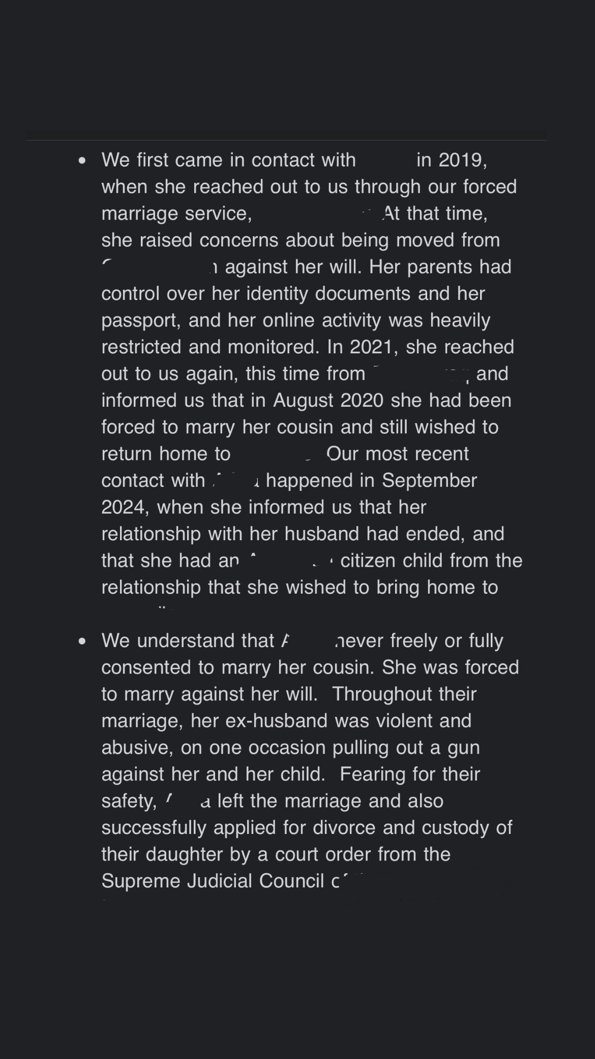Years have passed, and I finally found the courage to escape. I’m now divorced after years of physical and emotional abuse at the hands of my forced marriage partner, and I have a beautiful young daughter who deserves a future filled with freedom, safety, and opportunity, not the cycle I was born into.