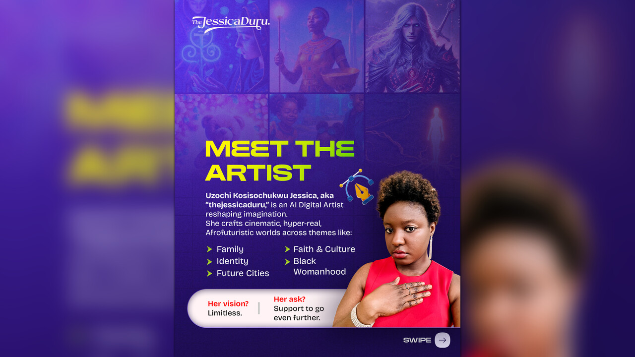 Uzochi Kosisochukwu Jessica, known creatively as “thejessicaduru,” is not just an artist — she’s a world-builder. A visionary AI Digital Artist, she creates cinematic, hyper-detailed, hyper-realistic imagery that reimagines Africa, family, faith, sisterhood, and future cities.