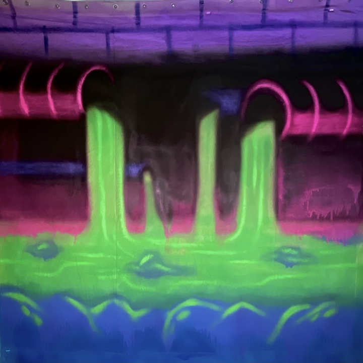 One of a kind painted backdrops used behind our pit of jello. 2 options: green or red. Very heavyweight fabric with grommets for hanging as a curtain.