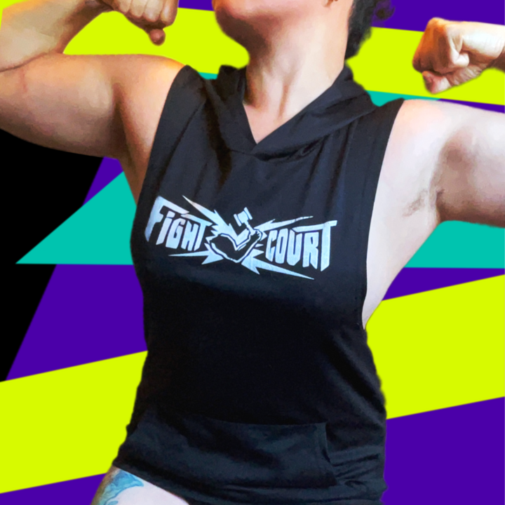 No sleeves? No problem! Quick dry muscle tees with hood & kangaroo pocket. Screen printed logo. Size M unisex only. Extremely limited quantity, will not be reprinted!