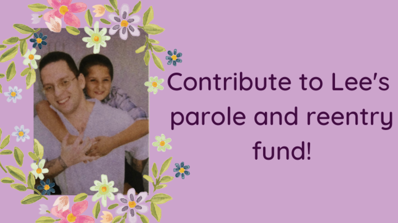 [Image description: On the left there is a photo of Lee and their son surrounded by cartoon flowers. To the right, the text "Contribute to Lee's parole and reentry fund!" appears in dark purple text on a light purple background.]