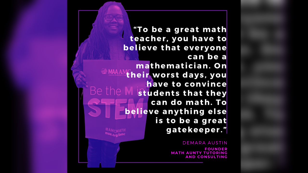 My name is Demara Austin, and I founded Math Aunty Tutoring and Consulting. I moved to Prince George's County, Maryland, in first grade and attended Seat Pleasant Elementary, Hyattsville Middle, William Wirt Middle, and Bladensburg High Schools. After earning my bachelor's degree in mathematics from St. Mary's College of Maryland and a master's in mathematics from Kansas State University, I returned to Maryland to teach.