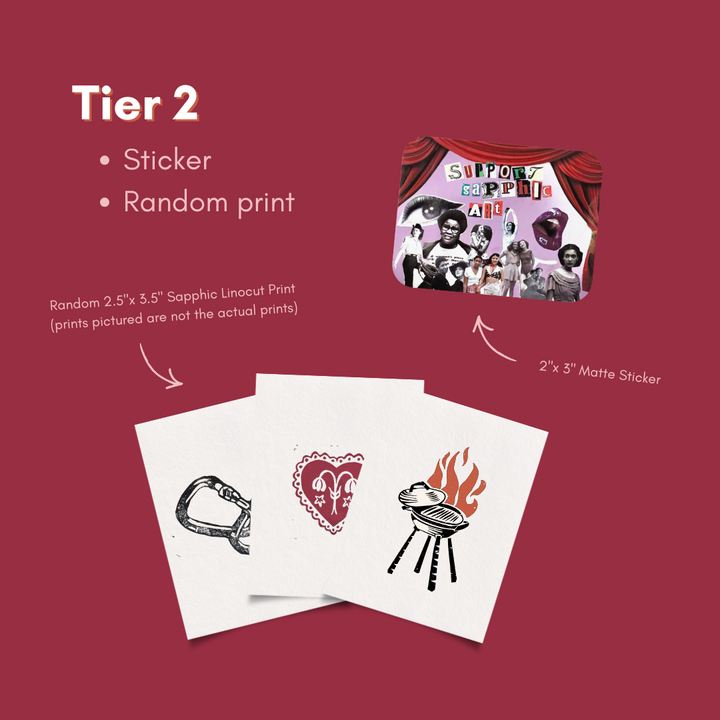 • A random linocut print of something sapphic or thematically relevant to the show (2.5"x3.5")