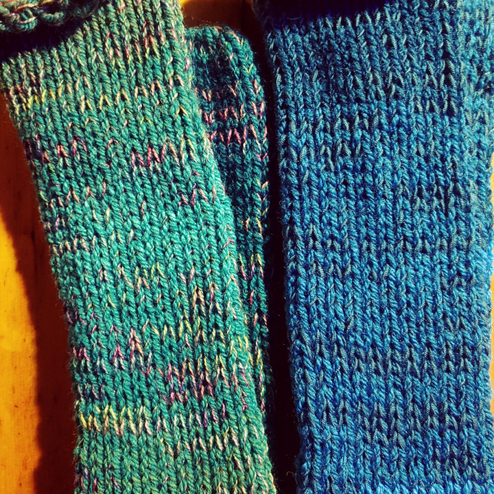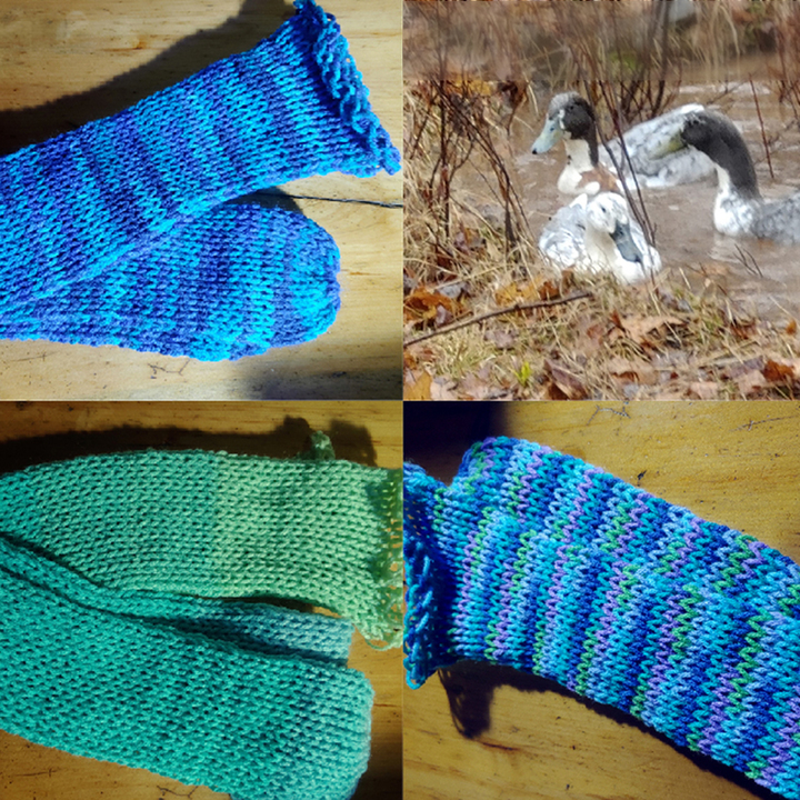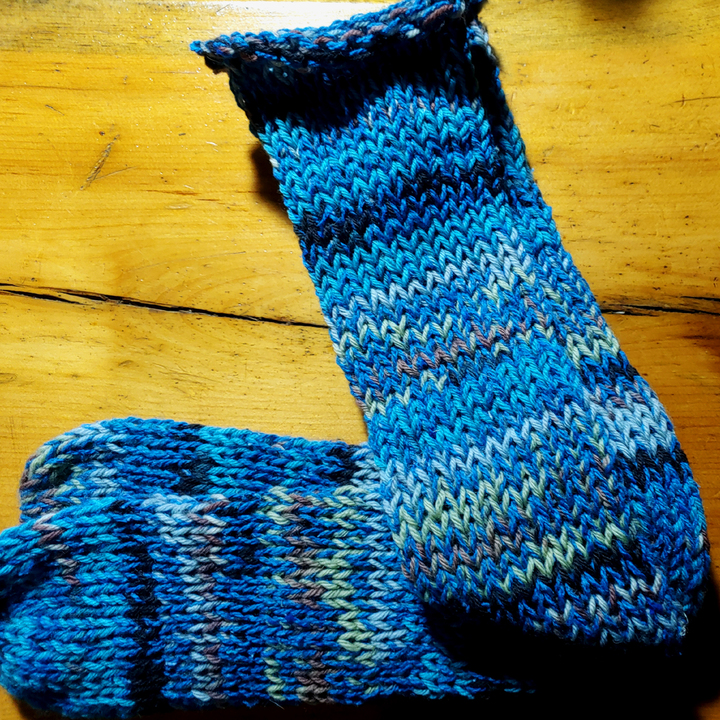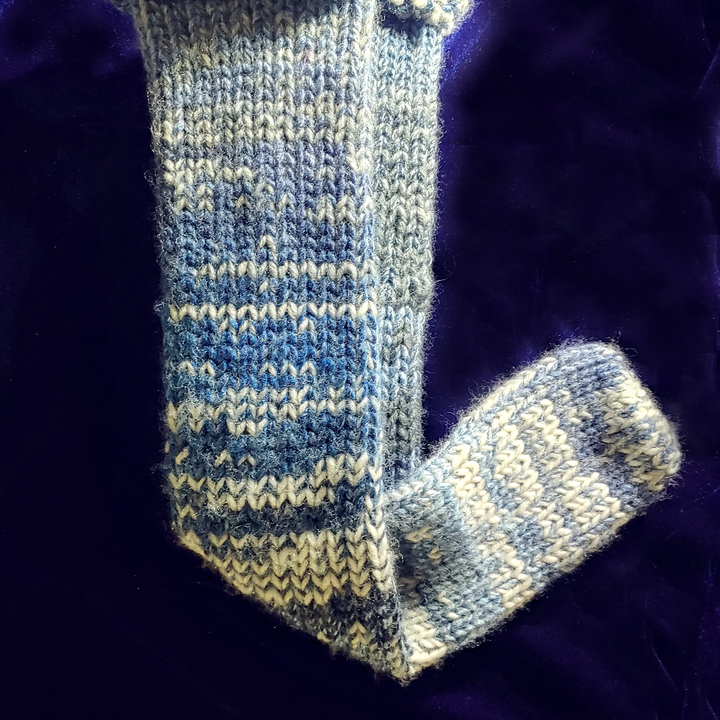 These are double knit soft yarn stockings made from a straight run of Lion Brand Scarfie in bluestone (22% wool) and Ferris Wheel blue acrylic yarn. The yarns together create a repeating pattern of light and dark in complimentary colors (but not the same). They are good for comfort, lounging, with slippers & no ties or bindings, an extra layer of home warmth in winter. They are 22 inches long stretch wide to 15 inches as needed with an average length somewhere between crew and knee high. These are stockinette tube socks, with three extra yards of yarn for darning or change in recommended hand wash, dry flat. What they do is bring back softness and thickness to stockings without polyester or binding; what they provide: up to one bag of feed (corn is at 12, mash at 15, and pellets 22-29). When you donate at the $15 level, you have these as heartfelt thanks.