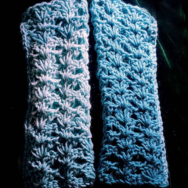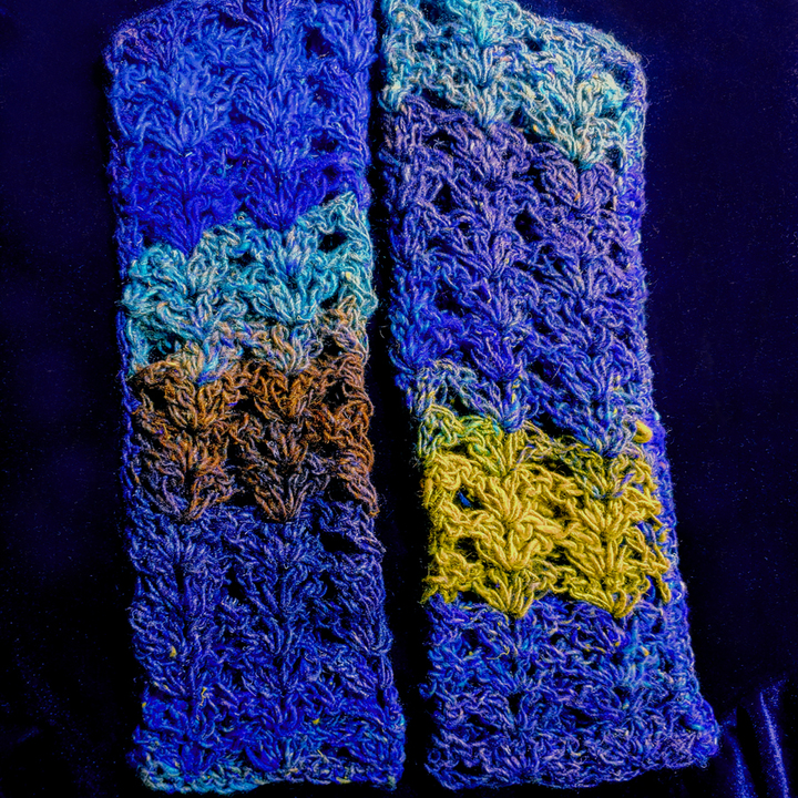 These are hand gauntlets, fingerless gloves in a shell pattern from Verbena Superwash wool in indigo and purple ombre with bamboo cotton and/or linen in blue. Supply is limited; and if by special request Noro Silk Garden's hand dyed colorways in 40% wool, 25% silk, 10% mohair. All varieties for indoor or outdoor use depending on climate. Light to medium weight they are decorative and functional offering some protection from cold and sun, at about 11-12 inches long with stretch to circumference 9.5 inches Colors are as above, and varied as available. Now also in other wool blends or acrylic to be agreed upon later. Hand wash dry flat for a gift that lasts, with a 20% off promo until Oct. 16th.