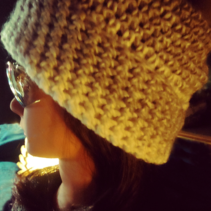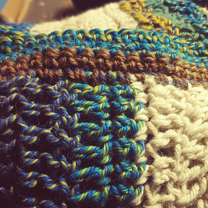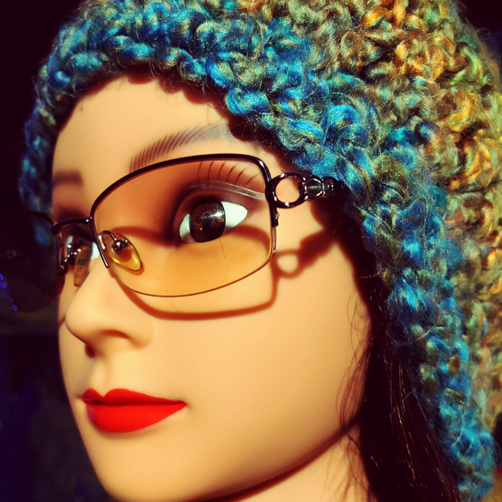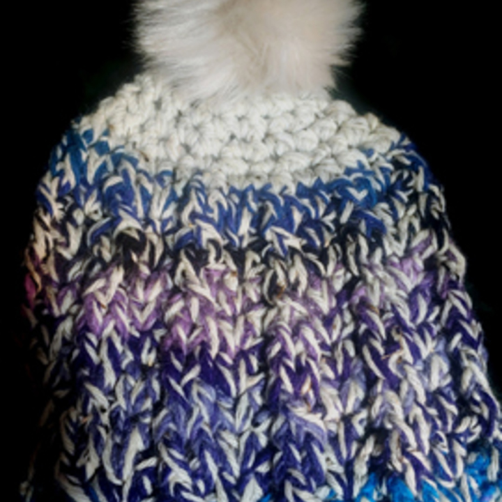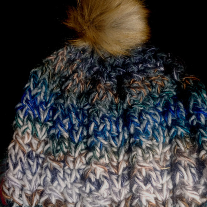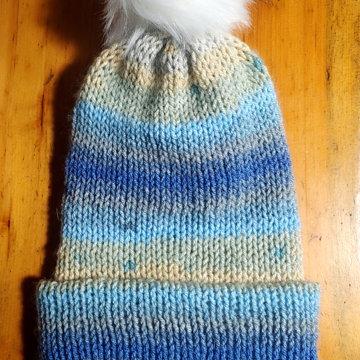 This is a Premier yarns Colorfusion Seaside yarn in a look for winter or early spring. Their design hints at sandy beaches with blue waters on a bright horizon. As a painting, you can almost see the small trees and birds in flight. As a cap, it's knit, double layered and acrylic with a bright pom pom you can change or adjust. It is super soft, hearty enough for winter and stretches to 12 inches long with cuff on, and up to 23 inches wide. It is machine washable, tumble dry (no bleach or iron), a yarn tested eco friendly and safely free from allergens.
