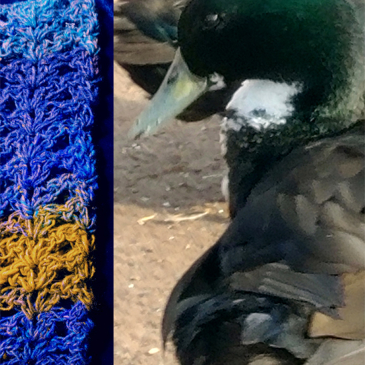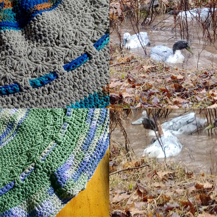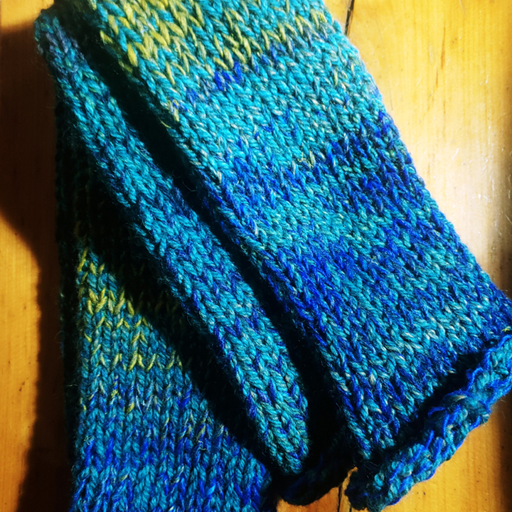 These hand gauntlets in shades of teal are similar to those in Noro Silk Garden but they are warmer, medium weight washable and dryable acrylic. They follow the design of inner fold, high point at the forefingers, low at the pinkies, outer seams and room to extend a thumb between the shells. They can be worn in different seasons but the shell pattern may let in rain or snow. So when you wish design in hand gauntlets, they are comfortable alone; but one can also wear magic gloves beneath them in uncertain weather. In trying out these different things you may find you have a pleasant style and comfort in wearing them in changing conditions too.