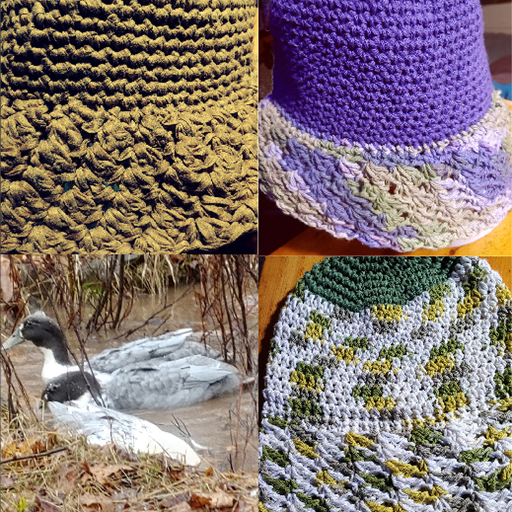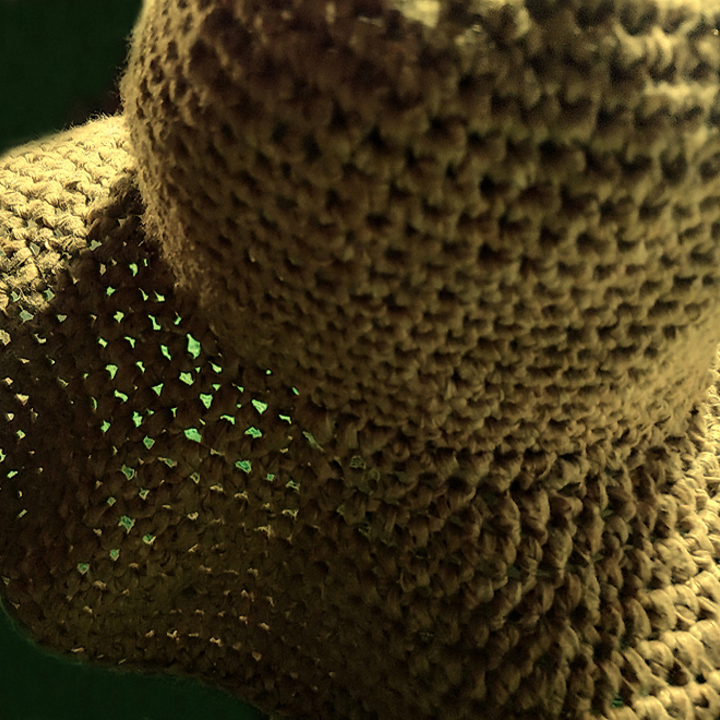 A light weight Spring-Summer sun and gardening hat with hand crocheted shells throughout in Lion Brand Rewind Hawaiian Ocean yarn, a washable rayon-polyester hat to fold up and go into your pocket or bag to take wherever you are. Machine or hand wash, dry flat, no bleach.