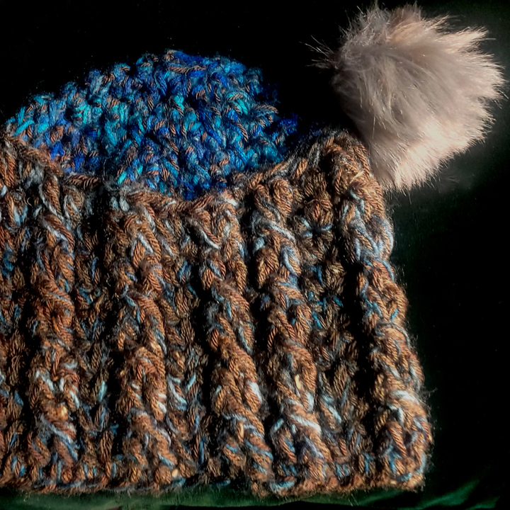 This is a mixed yarn acrylic cabled hat, wash and dry on gentle; yarns include Caron Simply Soft taupe, Vanna's Choice barley and Red Heart's very blues macaw. It's a lovely set of blues but includes a faux fur silver fox pom pom to add on or remove, as desired.