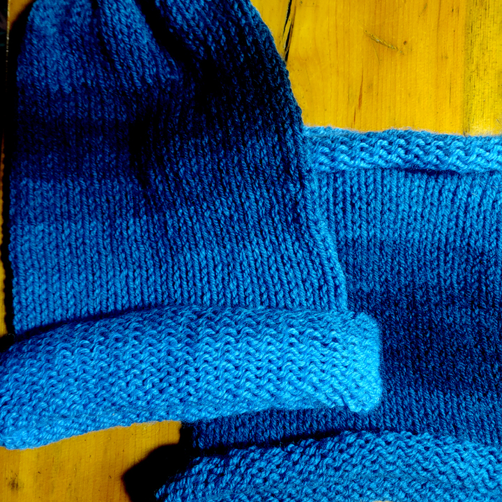 Watch cap and cowl set knit in Plymouth yarns Encore Colorspun Blueberry Ombre, 25% wool and acrylic, machine wash and gentle tumble dry. Cap and cowl use rolled brim edging, cap may extend to 14 inches by 23 circumference; cowl to 12 inches long. It's a nice set to take and go, or swap, wearable for two on an outing. This Plymouth yarn is in shades of blueberry to navy with a touch of sky.