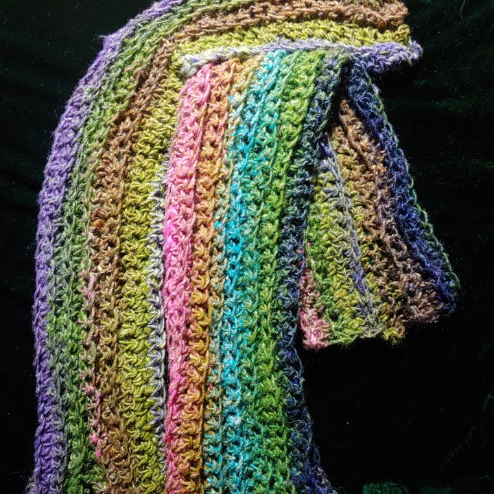 Arm Gauntlets or Leggings are hand made crochet: two open end cylinders about 19 inches long and can stretch up to 14 inch circumference. They are made from wonderful Noro Silk Garden yarn including wool (40%), silk (25%), nylon (25%), and kid mohair (10%). The stitch is a backstitch single crochet allowing for strength and stretch. They can be used for arm gauntlets, long Victorian fingerless gloves, leggings with open toe ends, slouchies. They are offered as is, you can make them into what you like & mend or change. Care is dry clean or hand wash dry flat. Noro is Japanese hand dyed yarn with varying design and colors, there is nothing quite like it. Crochet is based on fisherman's knots: together these have a fragile beauty and their own kind of strength, good pieces to take care of. They are your bonus at the $31 level. Happy Holidays!