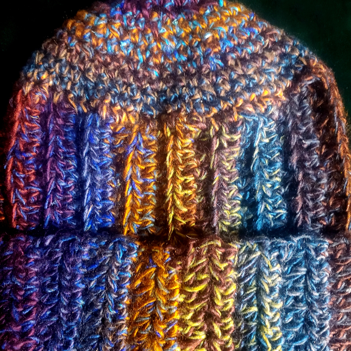 This many colored Watch Cap is a large, stretch 23-26 inches, made of Lion Brand Landscapes Mountain Range acrylic yarn reinforced with strong Noro Silk Garden yarn in 40% lamb's wool, 25% silk, 25% nylon and 10% kid mohair. Fits many adult sizes, cuff may be folded down. Recommended hand wash dry flat. This Noro yarn is like no other. Neat! It lasts.