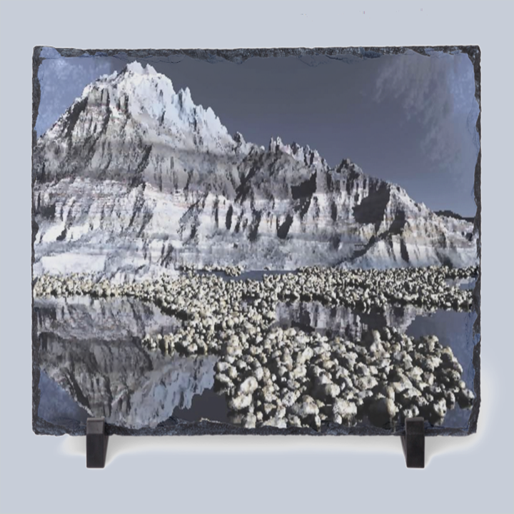 This is only made by request. It depicts a wintry mountain range (possibly reminiscent of Alaska) on rough edged slate. It is 8x11" with stand. A unique gift for the holidays, as is, shipping costs covered. Please inquire ahead as to whether this item is currently available. See gallery view for perspective.