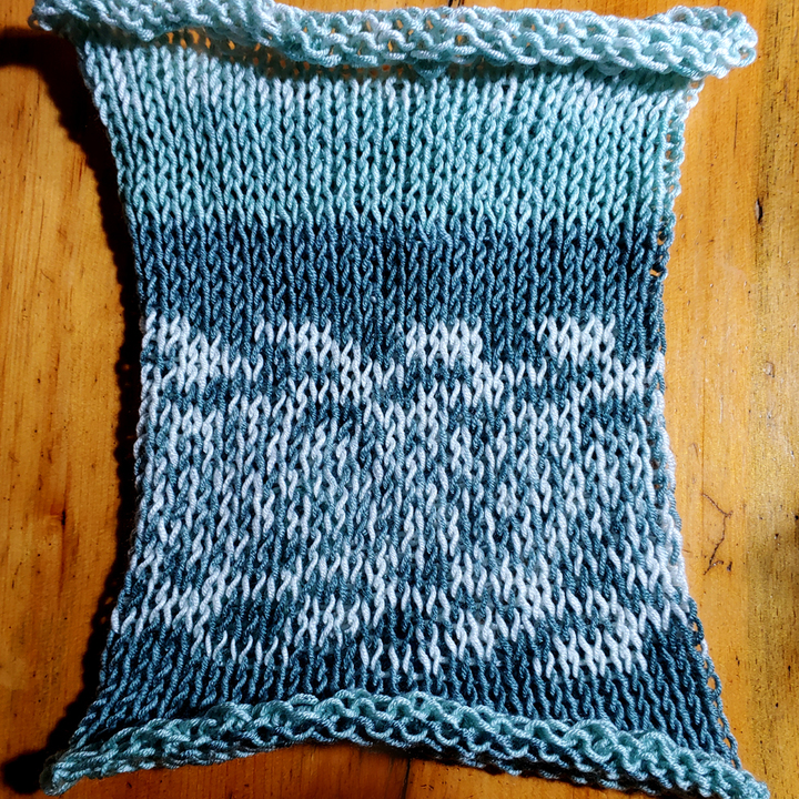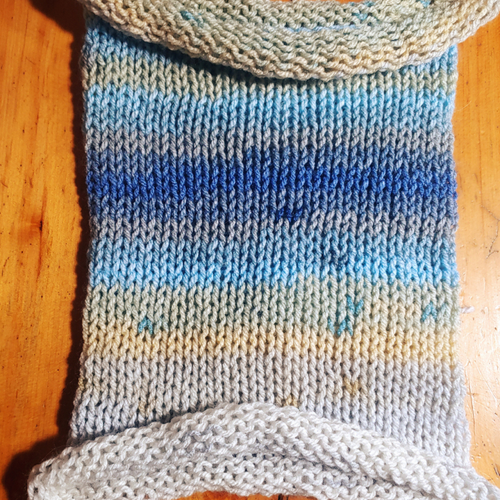 Seaside Cowl/neck warmer matches the double layer knit hat (above). It is fashioned in Premier Colorfusion Seaside acrylic yarn with a roll brim which may also be turned into a cuff. It is stretchy without tight boundaries to up to 15 inches long or circumference 24. Pulled up it becomes a face covering. Folded in half it becomes a wide headband with ruffled top. A ribbon threaded near the top can give it ties or turn it into a hat. It is medium to light weight good for indoor outdoor use; machine wash, dry, no bleach or iron. It is one piece lovely for so many things. Enjoy!