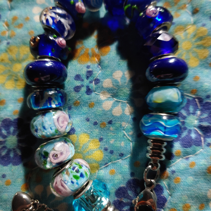 The Keepsakes Ltd tab describes this prayer bracelet in detail, made of Murano Lampwork glass beads and stainless steel chain, with adjustable fittings and lobster claw clasp. For now there are only two, one in royal blue and aquamarine with sky blue flowers and one in emerald green and blue, also with flowers. At this time they ship USPS Ground Advantage with tracking. With many thanks.
