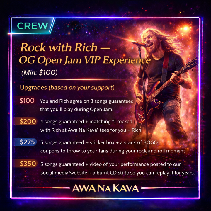 $200: 4 songs guaranteed + matching “I rocked with Rich at Awa Na Kava” tees for you + Rich.
