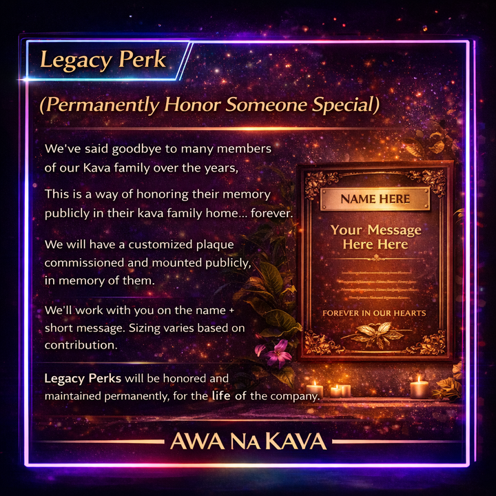 Fine print: Perk pickups begins after Grand Opening. Legacy Final design approved by Awa Na Kava; respectful language only.