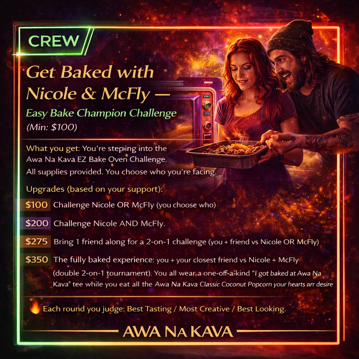 $350: The fully baked experience: you + your closest friend vs Nicole + McFly (double 2-on-1 tournament). You all wear a one-of-a-kind “I got baked at Awa Na Kava” tee while you eat all the Awa Na Kava Classic Coconut Popcorn your hearts can desire.