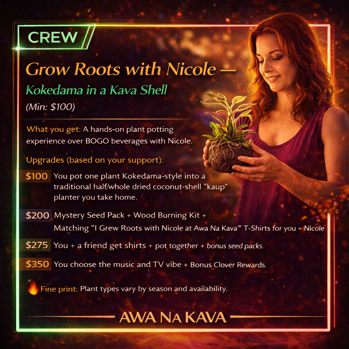 $100: You pot one plant Kokedama-style into a traditional half/whole dried coconut-shell “kava cup” planter you take home.