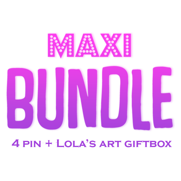 Maxi bundle : You will got 4 pin from choosen designs and a giftbox between the value of $85-90 including the pins. The giftbox may include t-shirt, handmade pencil case, wallet, sticker, badge, notebook, totebag, drawstring bag, prints etc.