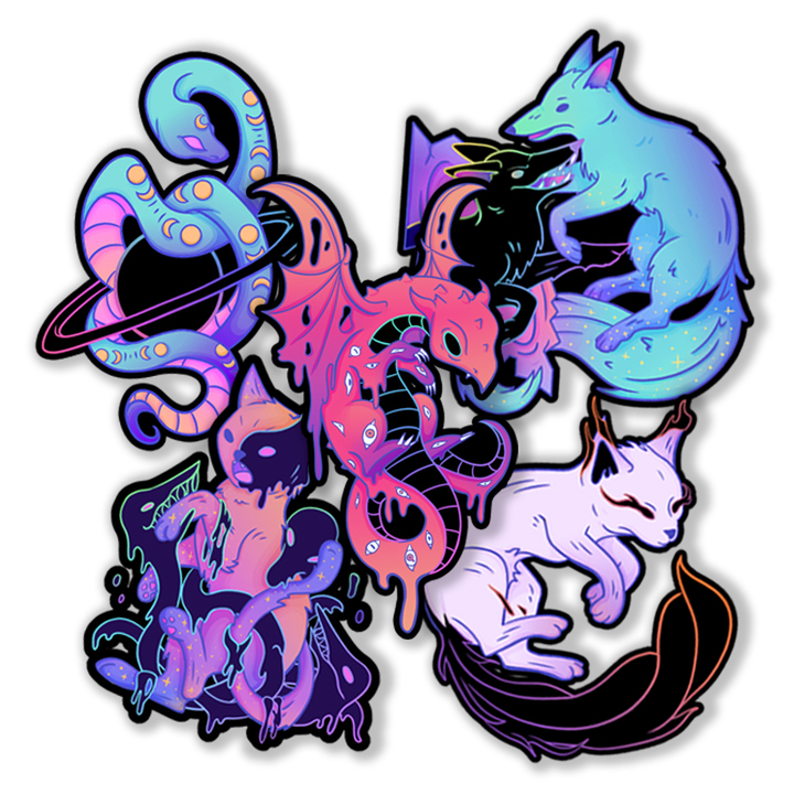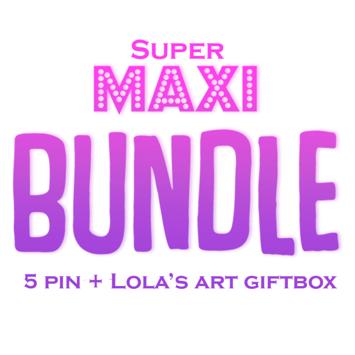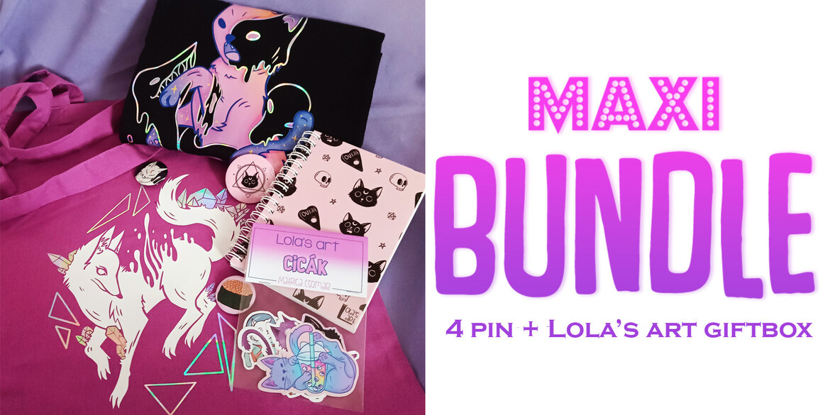 Super maxi bundle: You will got 5 pin from choosen designs and a giftbox between the value of $ 120-130 including the pins. The giftbox may include: hoodie, t-shirt, hand sewn crossbag, pencil case, wallet, notebook, totebag, drawstring bag, prints etc.