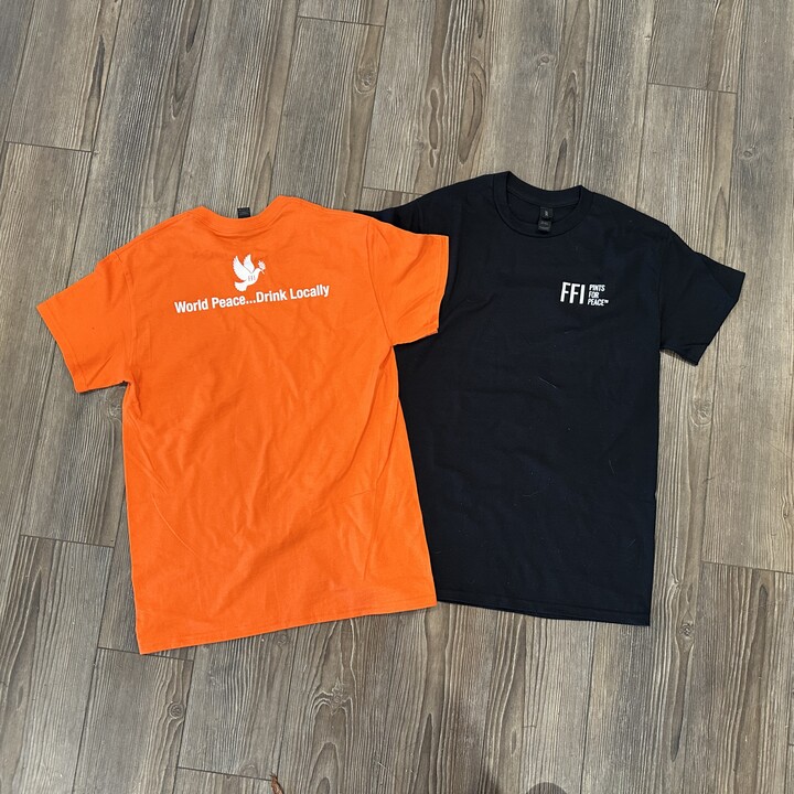Get your Pints for Peace T-Shirt today! This shirt has the slogan "World Peace...Drink Locally" on the back.