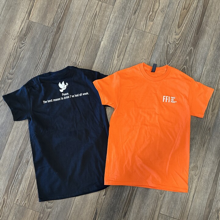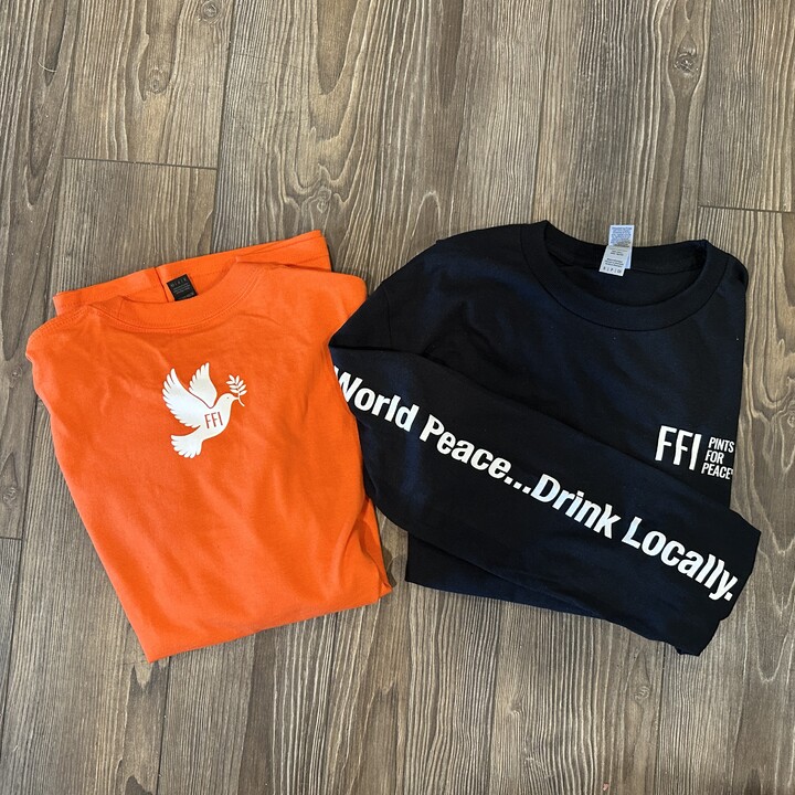 $30: Pints For Peace T-shirt & three drink vouchers to participate in our main in-person event. (Updated t-shirt colors for 2025!)