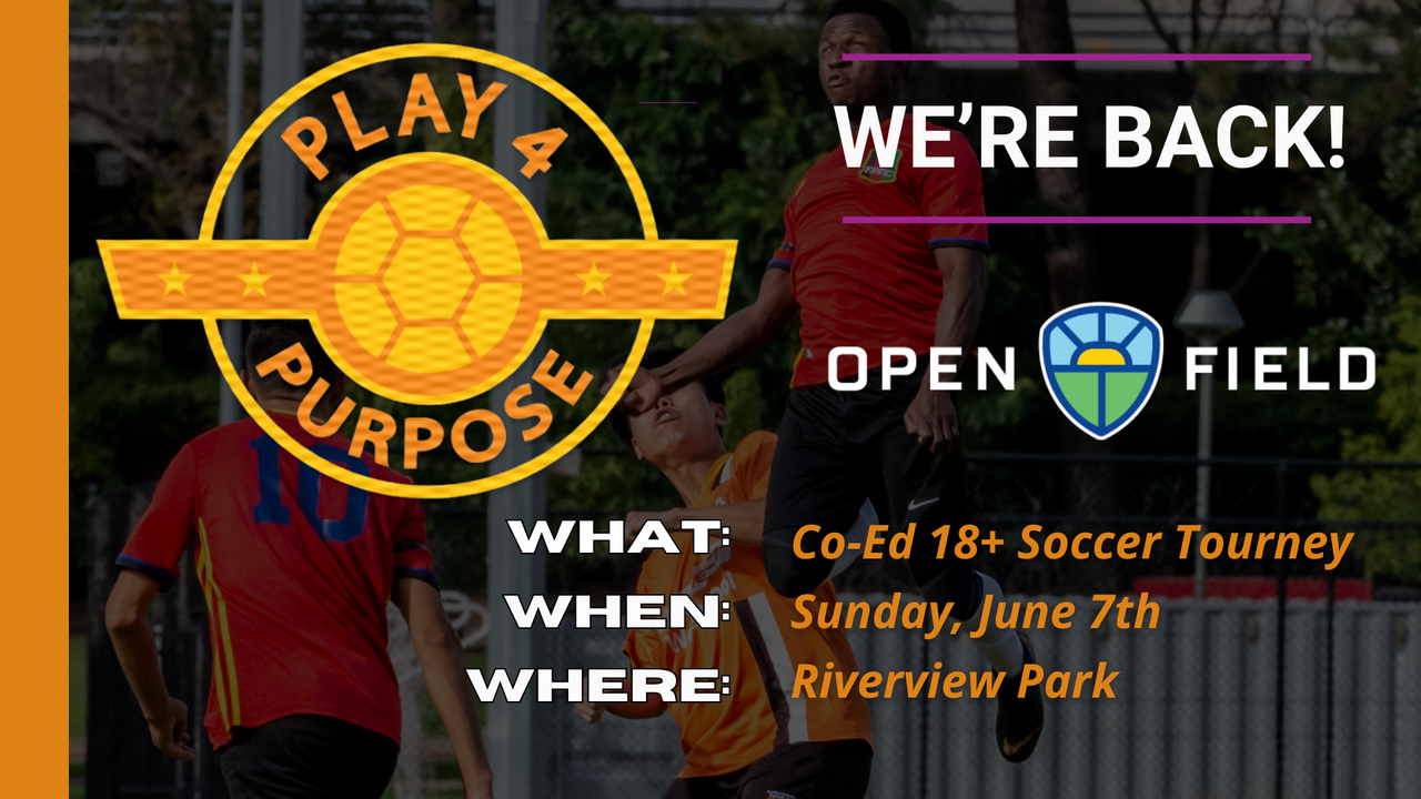 PLAY4PURPOSE is Open Field's annual tournament and community fundraising campaign, where Open Field supporters have the opportunity to play soccer for a good cause. The 2026 event will be held on Sunday, June 7th at Riverview Park Soccer Field.