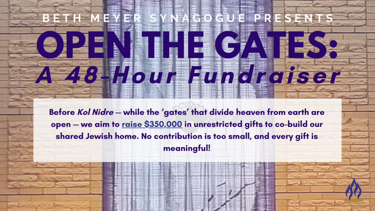 Open the Gates is an annual appeal to the members and friends of Beth Meyer Synagogue in Raleigh, N.C. to jumpstart the Jewish New Year with charitable giving before Kol Nidre ― while the celestial "gates" that divide heaven from earth are still open.