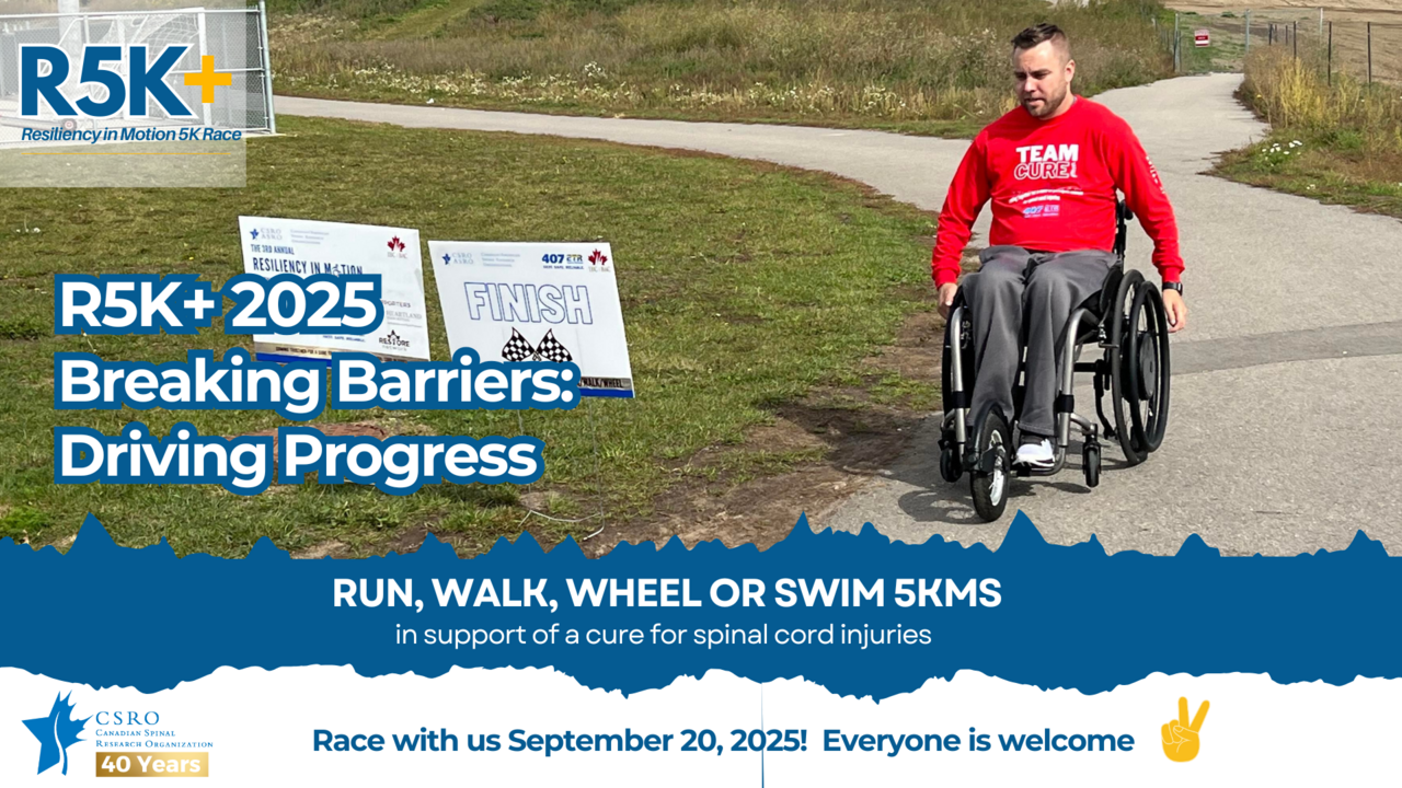 The cure for paralysis caused by spinal cord injury is a goal the CSRO has been working towards for a long time. On September 19th, 2020 join us virtually or in person at North Maple Region Park to run, walk, or wheel 5km in support of SCI research!