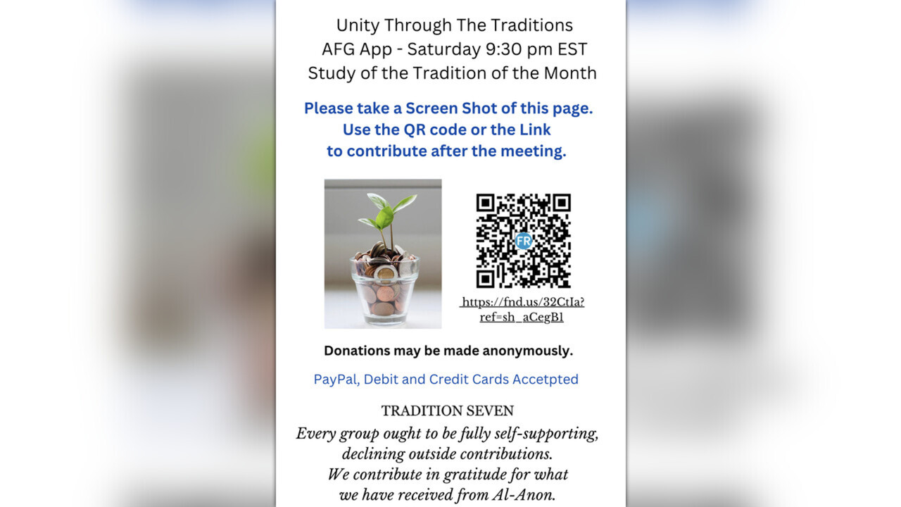 Tradition 7: Every group ought to be fully self supporting, declining outside contributions. While we have no dues or fees, Freedom AFG does pass an electronic basket to cover group expenses. At this time, Freedom AFG 2023 expenses include supporting o...