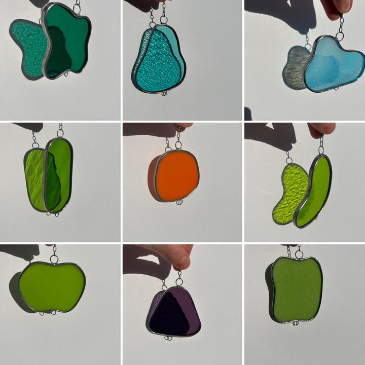 One unique stained glass piece that I like to call “BLOBS.” Each piece is different and can be displayed individually or attached to others like it. Color and shape vary — truly one-of-a-kind. I don't plan to make these again.