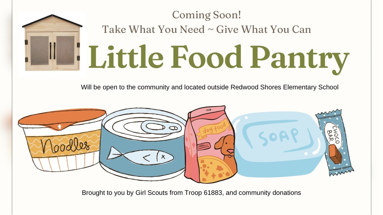 For our project, we would like to place a “Little Food Pantry” community pantry at Redwood Shores Elementary school. The food pantry would be similar to a little library; people can donate or take canned/ non-perishable goods as needed.