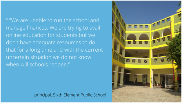 The principal of Sixth Element Public School, based in a small village in Greater Noida, associated with Reeii said “ Farmer’s children and students from underprivileged backgrounds come to get an education in our school. We were doing well in providing education to students in our rural area but due to the pandemic, our school is going through the worst time. We are unable to run the school and manage finances. We are trying to avail online education for students but we don't have adequate resources to do that for a long time and with the current uncertain situation we do not know when will schools reopen.”
