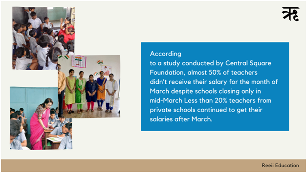 According to a study conducted by Central Square Foundation, almost 50% of teachers didn’t receive their salary for March despite schools closing only in mid-March Less than 20% of teachers from private schools continued to get their salaries after March. Some teachers in Telangana have found other means to earn their wages, including agriculture work, enrolling in MNREGA programs, and other manual labor.