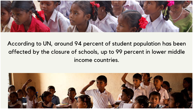 The current COVID situation demanded a dire need for virtual learning. Students and teachers had to adapt to the ‘new normal’. Students who come from a household where the earning member of the family is a daily wage worker have been hit the most due to this big change in education. In such tough times, where families are trying to meet ends it is difficult for them to invest in the resources required for online education. According to the UN, around 94 percent of the student population has been affected by the closure of schools, which is up to 99 percent in lower-middle-income countries.