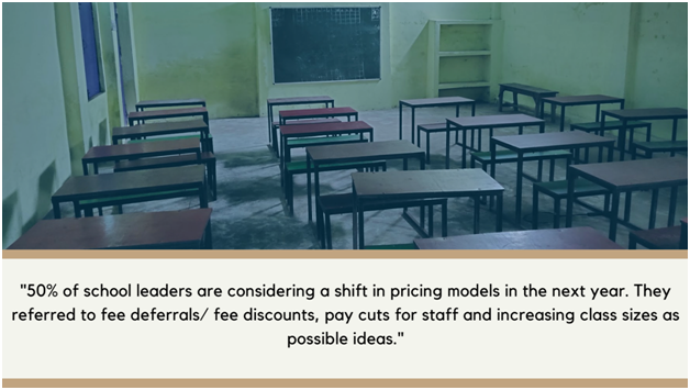 The study by Central Square Foundation said, around 50% of school leaders are considering a shift in pricing models in the next year. They referred to fee deferrals/ fee discounts, pay cuts for staff, and increasing class sizes as possible ideas.