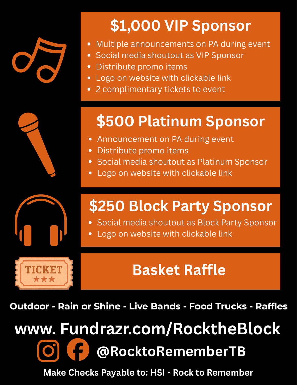 Whether you knew Tony personally or want to support a great cause while having an amazing time, Rock the Block is a day you won’t want to miss. Let’s come together, keep the music alive, and make history — one song at a time.
