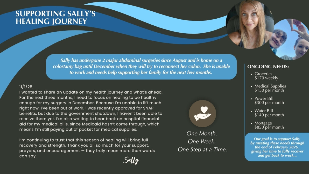 Recovery is more than just rest — it’s rebuilding strength, finding peace, and regaining stability. Your kindness (by giving and sharing) allows Sally the freedom to focus on healing rather than worrying about how to provide in this season.